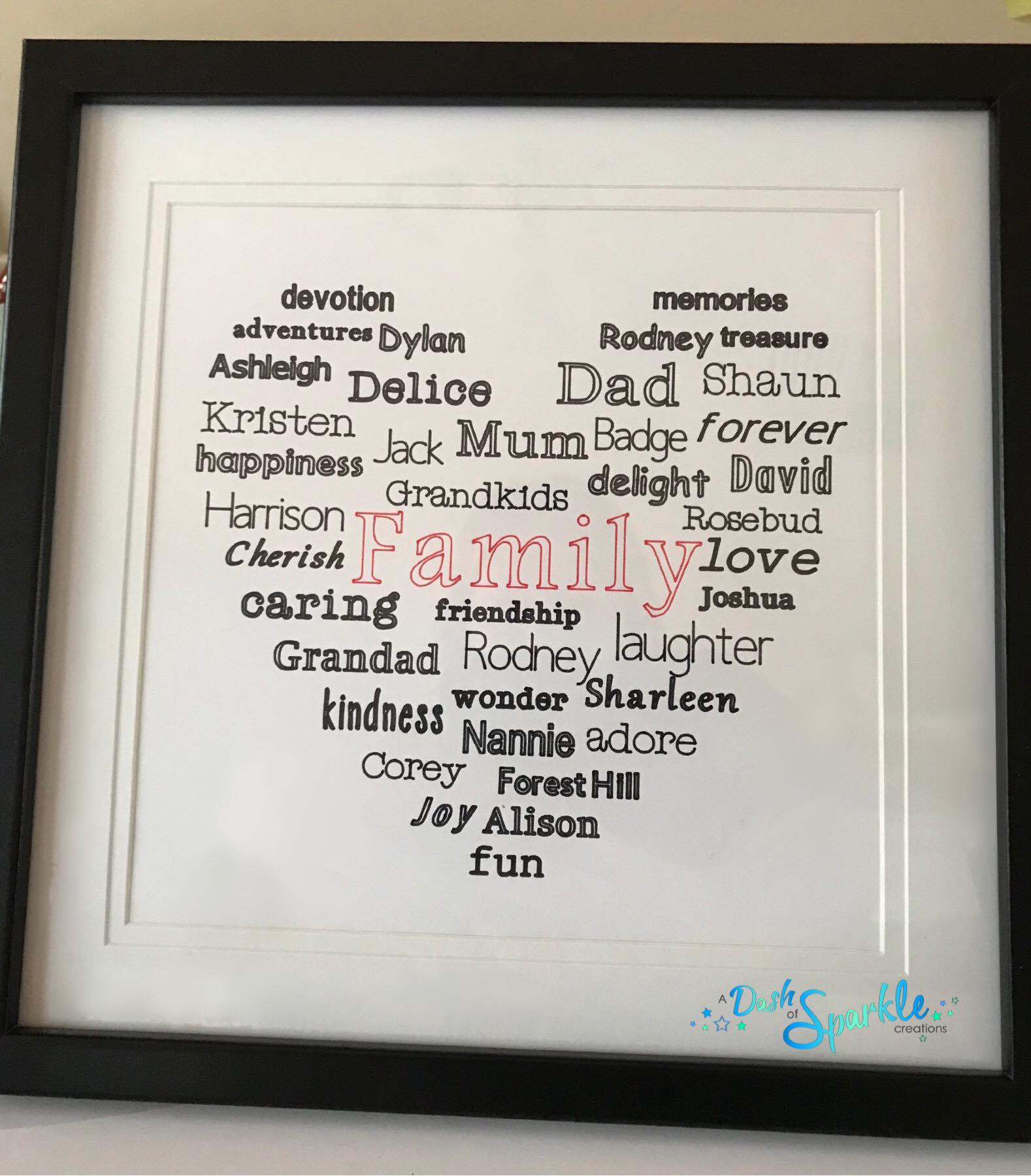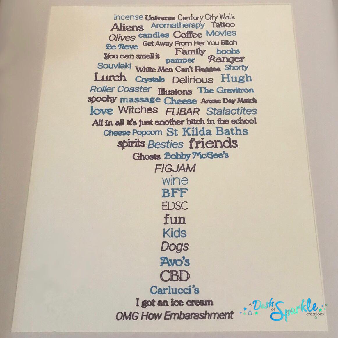 At checkout, please complete the form & list as many words (eg sayings, song titles, places, holidays, people, pets, favourite things, restaurants, etc) as you can to complete the shape of the design.  We request a minimum of 35 words but 40-50 words is ideal.